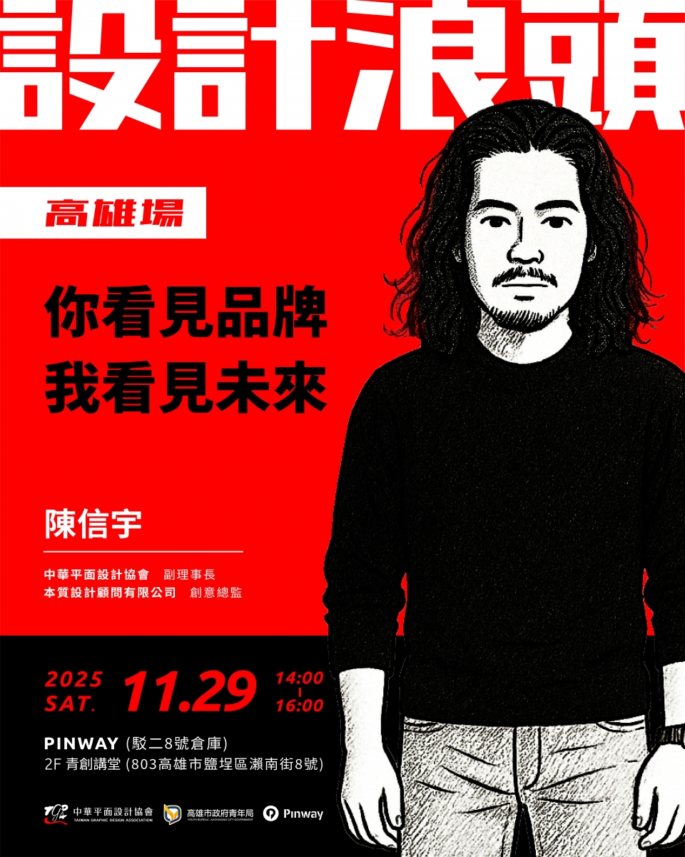 本次攜手「#高雄市政府青年局」,並由青年局提供「#Pinway|駁二8號倉庫」場地支持,第三場將由「#本質設計顧問有限公司」創意總監暨本會副理事長 #陳信宇 登台主講,以「你看見品牌我看見未來」為題,帶來深具啟發的品牌思維與實戰經驗。