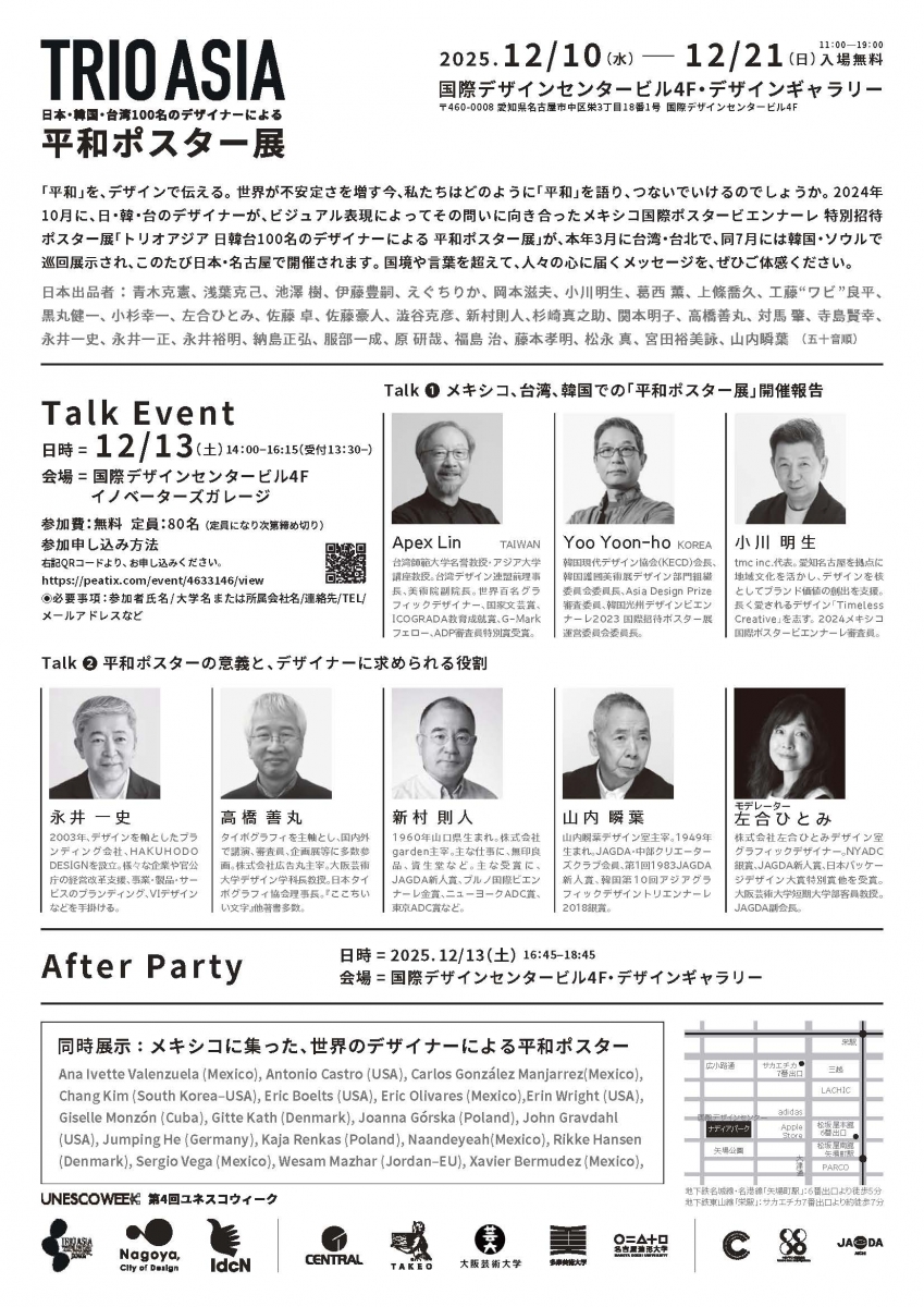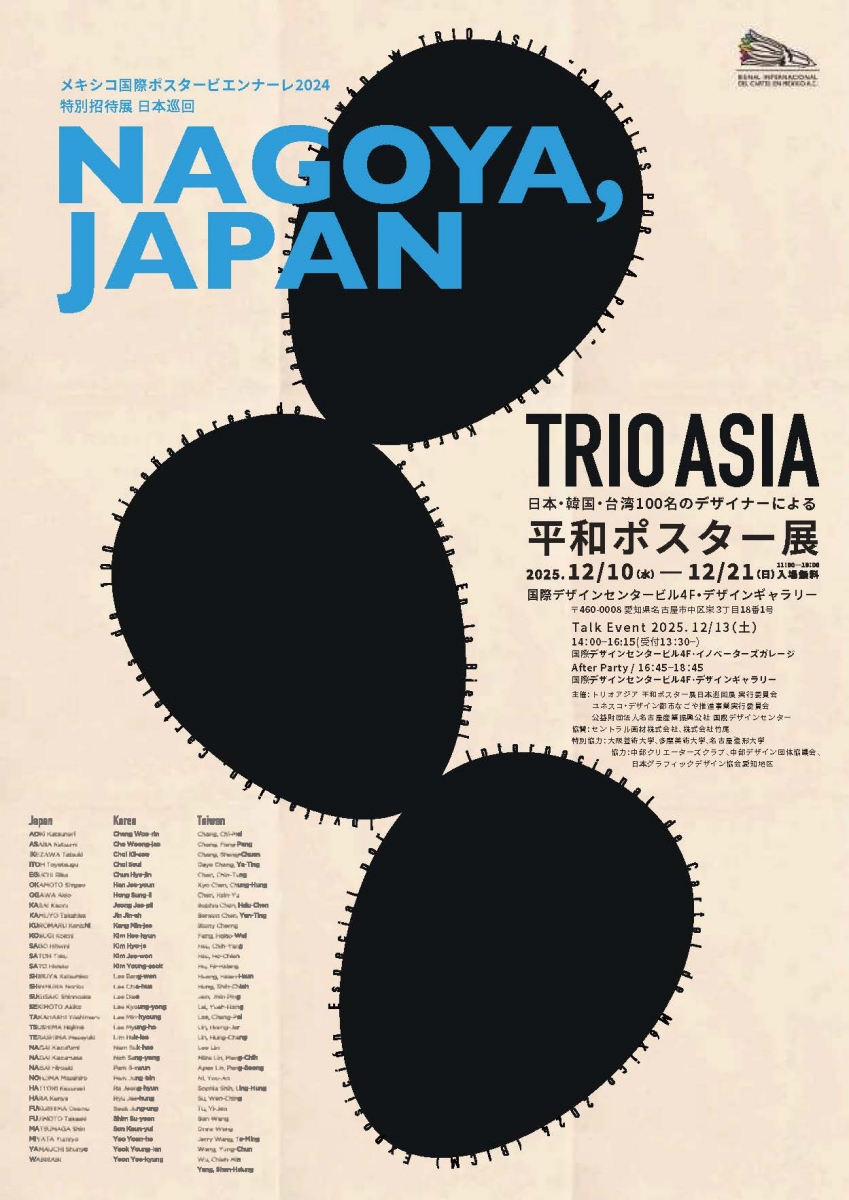 用「設計」傳遞「和平」,在世界局勢愈發動盪的當下,我們應該如何以設計去「表達」和平、並將這份理念「連結」到更多地方? 2024 年 10 月,來自日本、韓國、臺灣的設計師,以視覺設計的方式共同面對「和平」這個命題,策劃了 「TRIO ASIA —— 日韓台 100 位設計師和平海報展」。該展於墨西哥國際海報雙年展中作為特別邀請展首次亮相,之後,本展於今年 3 月移展至臺灣・台北,7 月於韓國・首爾展出,而如今即將在日本・名古屋巡迴展出。 邀請您一同跨越國界與語言,感受能直接觸動人心的和平訊息。